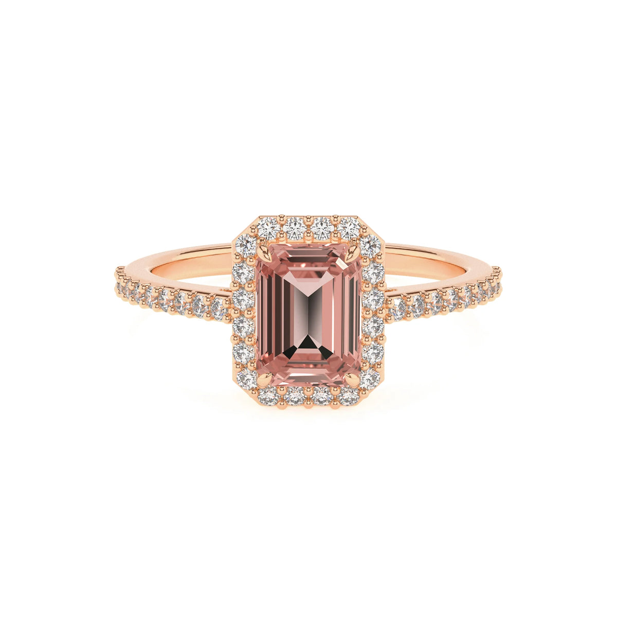 Introducing the GEM NOIR Lab-Grown Morganite Emerald-Cut Shape with Diamonds Halo Solitaire Engagement Rings in 14K Rose Gold—a versatile piece capturing the serene beauty of morganite. Crafted with 5x3mm lab-grown morganite gemstones in prong setting, offering a range to suit every style and occasion. morganite, the perfect birthstone for June, is known for its rich, calming pink hue.