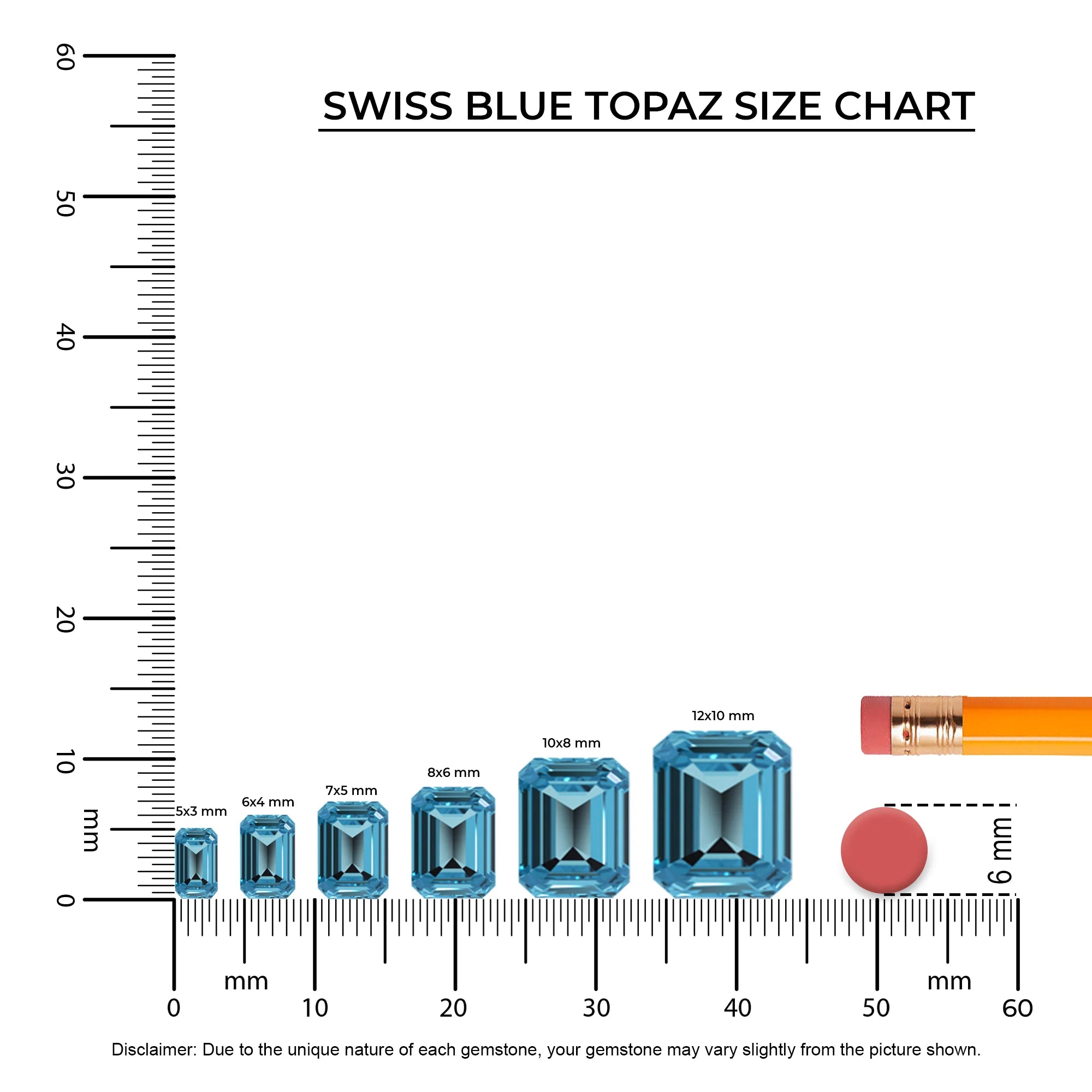 Introducing the GEM NOIR Natural Swiss Blue Topaz Emerald-Cut Shape Stud Earrings in Platinum—a versatile piece capturing the serene beauty of swiss-blue-topaz. Crafted with 6x4mm natural Swiss Blue Topaz gemstones in bezel setting, offering a range to suit every style and occasion. Swiss Blue Topaz, the perfect birthstone for December, is known for its rich, calming blue hue.